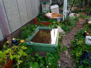 中: 空っぽに近かったコンクリ舟に一杯溜った昨夜の雨です。