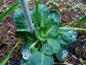 左: これは虫害を受けてしまった芽キャベツ。中: キャベツ苗と春菊苗。右: ホウレンソウが雨風で北側に倒れていましたので、真ん中で左右に分けました。後で紐を張り、立たせます。