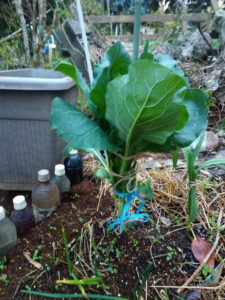 21日の日中から夜中にかけての雨と風で?、雨と風を利用して?縛りから抜け出したブロッコリーを昨日の朝縛り直しました。そんなブロッコリーが2つありました。