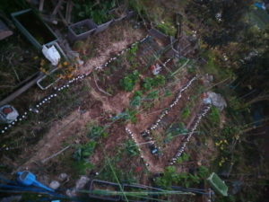 13時半、通路のジャガイモに篠竹の支柱を立て、縛って来ました。脇の通路が笹薮見たいになって来ました。風がきついし、日陰は寒いので、一旦退散です。
