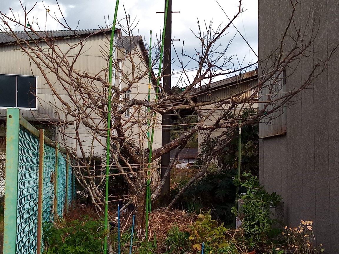 いよいよハナカイドウ、実梅、鹿児島紅も支柱を立てて、縛り始めました。