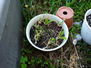 中: 昨日移植した矢車草の苗です。これもおまけの種でした。