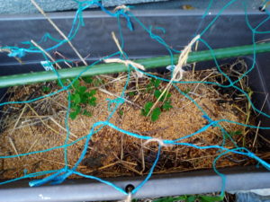 13時半、通路のジャガイモに篠竹の支柱を立て、縛って来ました。脇の通路が笹薮見たいになって来ました。風がきついし、日陰は寒いので、一旦退散です。