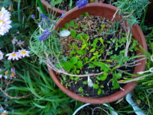 左: 玄関アプローチのプランタ―の中でこれだけは分かる。先に小松菜を移植した処だったので、縮み小松菜です。
