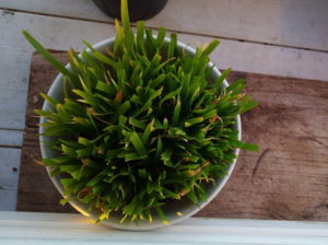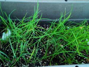 左: 猫草の実験中。小さな鉢で根詰まりを起こして先が黄色くなった燕麦です。今日、鉢増しをします。先っちょの黄色い部分は鋏でチョキン、と切りました。
