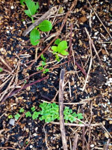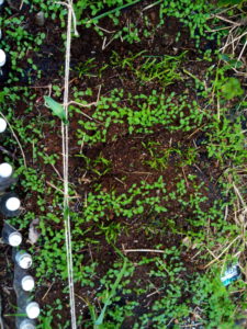 中: 水菜の復活。上に見えるのはサツマイモですが、5度以下でサツマイモは腐るので、来週中には掘り上げないと、最低気温5度になりそう!