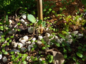 中: 虫害を受けやすい野菜の一つブロッコリーです。今年は蒔き時期を無理させたので、小さいままですがこれでも、大きくなった方です。済みませんね。此処にも石を入れました。