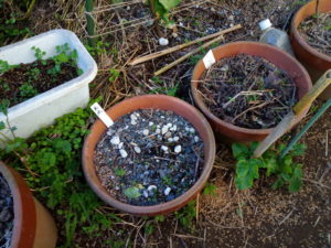 右: 今日こそ移植しようね、カスミ草さん。小さい苗四鉢を鉢上げします。。