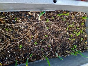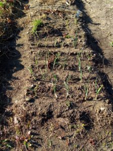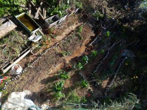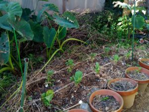 西隣さんの庭です。左: 玉葱、中: 四種のアブラナ科。右: 絹さや等も発芽しましたよ。