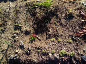左: 一畝のオオイヌノフグリの双葉の中で唯一違う双葉と本葉を出しているのは京水菜でしょうか?去年はやっていないから一昨年!?