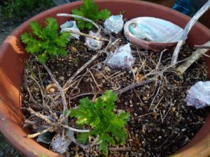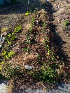 左: 春菊も地に平行した葉を出して来ました。後で縛ります。