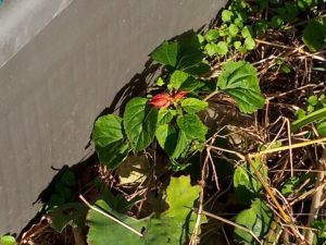 中: 絹さやさんの足元で蕾を見せているサルビアは秋以降に発芽したものです。