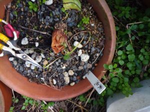 左: パンジ―は根元を縛って、葉も立たせました。