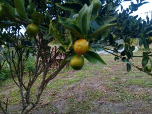 左: 大蒜もスクスク伸びて来ました。中: 蚕豆も元気です。 右: 金柑も色付いて来ました。