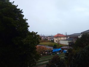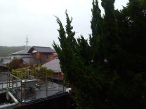 雨戸を開けるのは8時の風の状態を見てからだなぁ。既に表は白んでいます。東の雨戸を開けました。開けるだけで手がビショビショになり、ガラス窓は洗車場状態です。お隣の畑は通路が水びたしです。我が家の深く掘った通路には水が溜まっています。