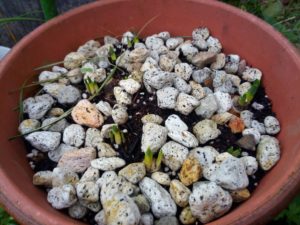 中: 昨年Y さんから頂いた白い水仙を浅い鉢に植えて一年経過。二回り大きくて深い鉢へ移植しました。既に芽が12個上がっています。確か6つか7つ位の球根じゃありませんでした?