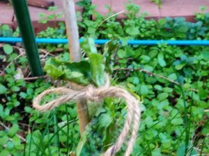 花ものも地面に葉が付かない様にしたら、違うのかな。確かに虫害や泥はねに因る病気は出ないでしょうね。見栄えに余り影響しない程度に麻紐で縛る感じで垂直仕立て栽培をしてみます。