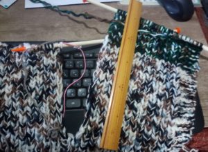 肩線で別の色に切り替えました。もう少し編んでから左身頃と繋ぎます。