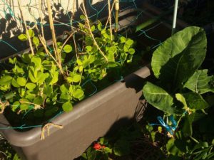 中: 一昨日結わえた蚕豆が顔を出しました。
