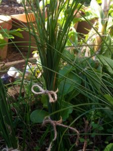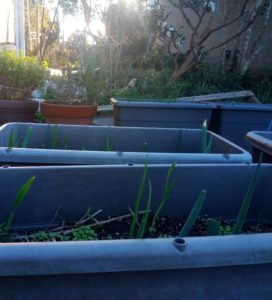 左: 朝陽に逆光ですが、プランターから葱の先端が飛び出して来ました。殆どが再生葱です。