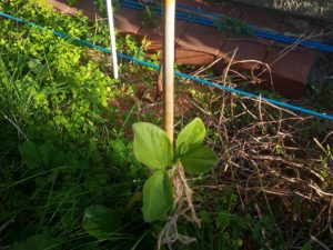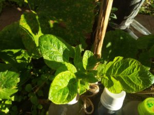 夜間生長は垂直仕立て栽培では縛り上げた野菜を見るとよく分かります。縄抜けするのは大体夜の内です(笑)。昼間は太陽光を浴びて光合成で得たものを体内に蓄え、夜になるとホルモン類が働いているんですね。私はこんな大きな丸葉を出すジャガイモを見た事がありませんが、今年は蚕豆もブロッコリーも大きな葉を出すものが多いですね。