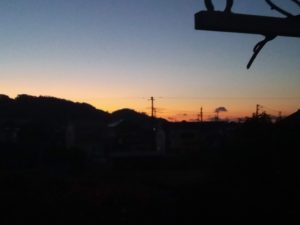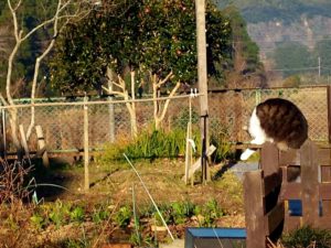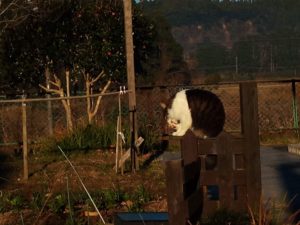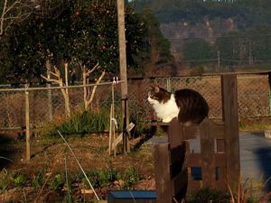 うめと福はジュレが終わりました。トラ子も終わり、薄暮の中へ出て行きました。私は湯たんぽの準備です。トラ子とうめは寝る態勢です。福は出たり入ったりしています。