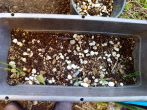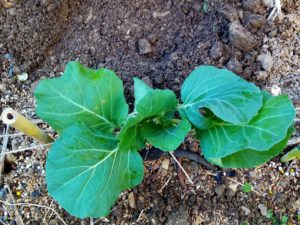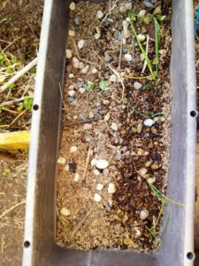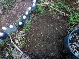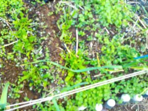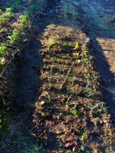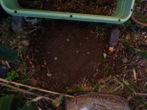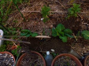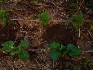 右: 暗いけれど、キャベツ畝に置いた土は礫が沢山入っています。