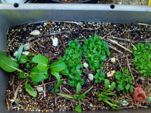 中&右: ジャガイモプランターに植えた物干しにあった葱苗…もしかして万能葉葱。