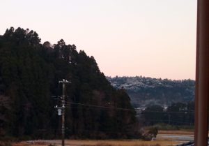 御宿霊園の山の樹も白くなりました。物干しに足を乗せるとツルッ、と行きそうです。そして次の瞬間、ソックスが床に張り付きそうになります。物干し竿の水滴はコチコチに凍っています。
