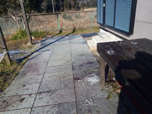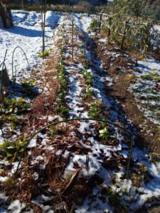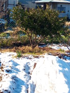 10時周りのお家の屋根が溶けました。西隣さんの屋根は落ちる時はバッサバサと落ちて来ますので、びっくりしますよ。畝の写真を撮っていたら、バッシーン!、とファーマーズテーブルに氷の塊となって落ちて来ました。