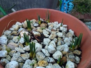 右: 中生の水仙です。地上部は少しずつ、でも、きっと根は良く張っていると思いますよ。