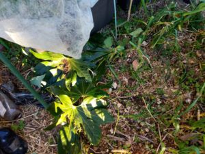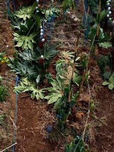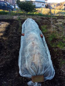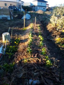 オレンジカリフラワーを収穫した処に、そうだよね、グランドペチカを植えよう、と小さめの芋を5つ植え込み、タンニン鉄をたっぷり撒きました。上からホトケノザやオオイヌノフグリなどの草を米糠を塗して、籾殻も混ぜて八手の葉っぱと一緒に置きました。3月までゆっくりお休み!籾殻は通気性を良くするためのもので、米糠は好気性発酵を畝上で促すためのものです。ジャガイモを収穫する頃には土寄せの土やその季節の草が更に上に積まれて行く事でしょう。