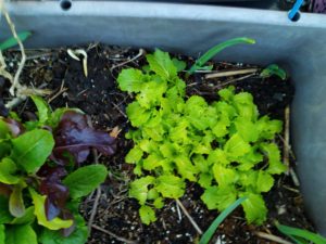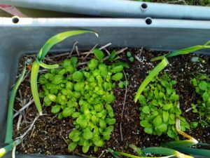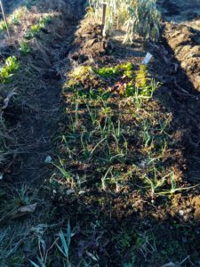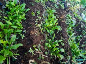 左: 日本ホウレンソウも本葉が大きくなりつつありますが、この低温ですからね。でも、虫は居ないし、糖化して甘い、と思いますよ。でも、薹が立ち始めたら早いですね。だから、食べる事が出来るのは短期間です。ロマネスコと重なる時季かも知れません。
