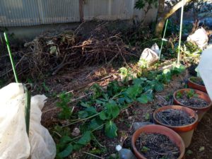 先日刈って置いて置いて乾いた草は絹さややグリンピースのプランターにも入れました。土の見える処が無いように、ドンドン置いて行きます。生ごみも乾いたら、今の季節はそれ程悪さをする虫たちがいないので…多分…置いて上から草や葉を掛けて置きました。キャベツさん達が何処においでか、分からない位置いてみました。春菊もそろそろ…というか遅すぎなんですが…主軸をカットします。