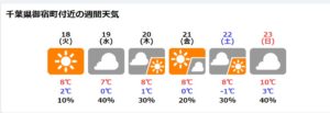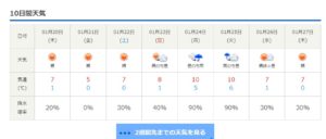 10日間天気予報は左記の通りです。あくまでも予想ですから、外れや修正もありです。雨の後も低温ですか!?まぁ、関東地方の一番の寒さは二月ですからね。