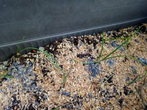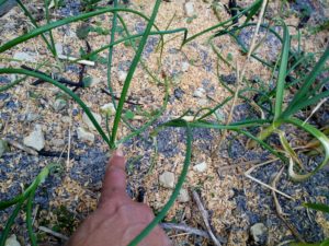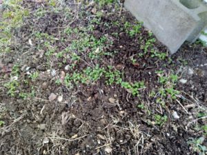 左: お借りしている畝に草を刈って載せたら、次の草の種が芽を出しました。1㎝3の中に何億個と入っている種ですから無尽蔵!ですね。これも大切な肥料です。