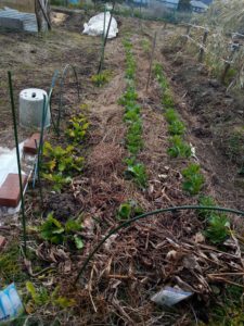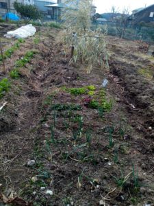 左: 日陰で殆ど見えないけれど三畝の玉葱です。