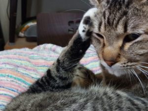 人の言葉を覚えるのも、福は早く、トラ子は無関心の様に見えましたが、自分の大好きな物に関しては福よりも速く覚えます。意識の違いですね。福は人間ぽい処があって、猫じゃらしで遊ぼうとしても最初は『そんな仔猫の遊びなんか!』、と半分馬鹿にしたような顔をして居ました。トラ子は小さい時と同じ反応で可愛いです。訓練の結果、今では福も喜んで遊ぶ様になりました(笑)。