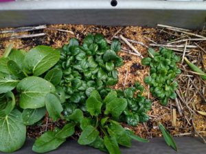 左: 縮れ小松菜。右: 少しかじかみながら咲いている鹿児島紅は年末から咲き続けて呉れています。
