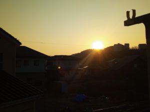曇っているから最初の光は海の上に届いている筈ですが、見えません。丁度真東―南東に掛けて雨雲がレーダーに映って居ました。