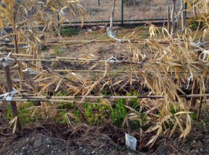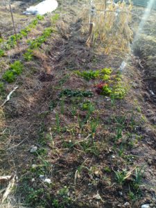 西隣さんの畝と、下段は絹さや…未だ下の方は黄色っぽいですが、確り持ち直しました。右は裏の蕗の薹です。いつもより一月遅れですね。