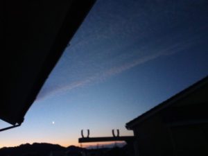 細い左舷の月が右の写真に見えます。東南東―南東から釈が出ています。