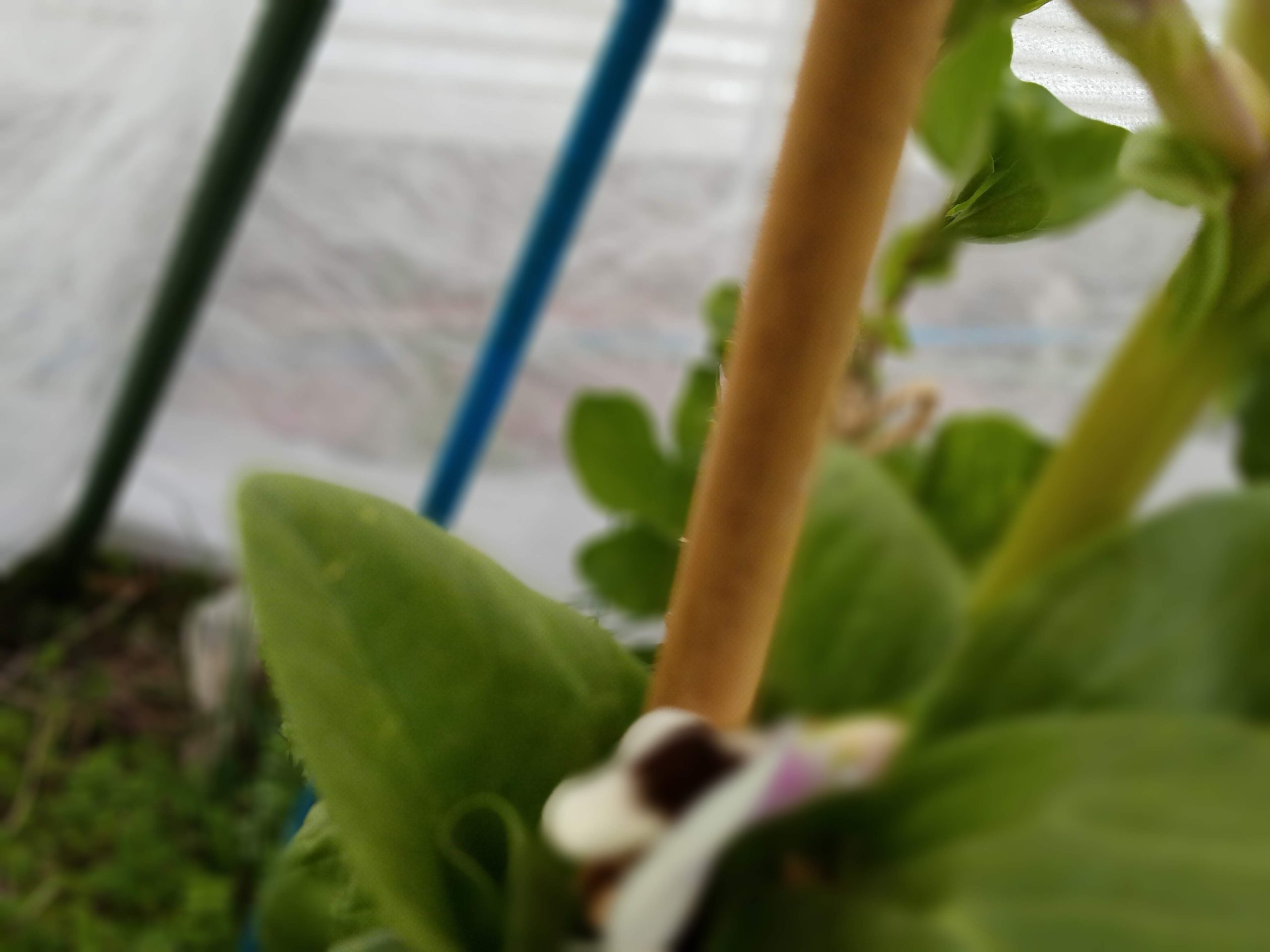 10月に播種して11月に発芽直後アブラムシからウィルスを貰ってしまった蚕豆さん。シワシワで赤黒い斑が出て可哀想。でも、引き抜くのはもっと可哀想…。その頃、垂直仕立て栽培を知り、この仔だけは可哀想で縛る気にならなかった。でも、途中で思い返して、アブラムシが居たものも居なくなるなら、ホルモンの力で治そうじゃないの!まっだ下の方はシワシワの葉があるけれど、上の方の葉は完治した、とみて良いんじゃないかな。こういう姿を見ると人間もだらしない姿勢をしちゃアカン、と思うんですよね。