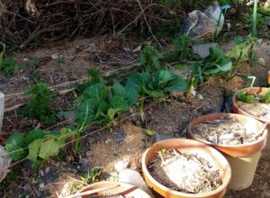 通路に野菜の生ごみを細かく切った物を放置して乾燥させていますが2月半ばになったら、乾燥して居るものを畝上に上げて見ましょう。三畝が良いかな。念の為、通路に海水EM活性原液を撒いて置こう。