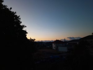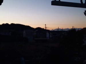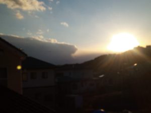 太陽の沈む位置が北に寄って来ました。12月半ばには西南西(左の写真で言えばど真ん中)に沈んでいた太陽がかなり戻って来ました。校舎が三棟並んでいますが、一番右側の校舎が真西です。