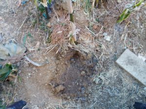 右: あ、誰か土竜君を掘り出そうとしたな!?後で海水EM活性希釈原液を流し込んでおこう。流し込みに行ったら土が内部から掘り返されてありました。土竜さんがブーブー言いながら、修復をしていたのかな(笑)。『誰だ!?他家様の巣を滅茶滅茶に掘り返す奴は!』な~んて言っていたのかしら。穴を空けて流し込みました。
