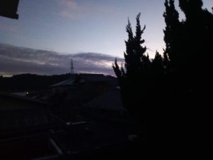 北東―北北東に雲が収束しています(6時19分)。6時7分前海の上には分厚い雲が見られますが、明けて来ました。分厚い雲の上の部分が赤く染まり始めました。