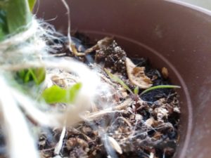 ニチニチソウ先生の鉢に出たトマトらしき双葉に本葉が覗きました。そろそろ一本立ちだけど、ペットボトルが安全かなぁ。