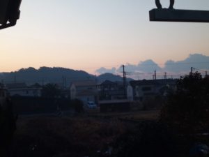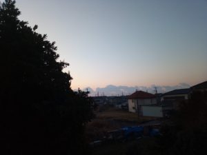 周りのお家男屋根が、特に銅葺き屋根はしっとりと濡れていますし、山の際は微かに靄っています。