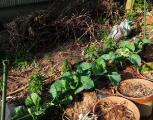 未だ発芽もしていないトウモロコシの予定地に八手や草を放り込みました。元々通路ではありますが、第一堆肥枠の養分がこの通路には流れ出ている、と思うんですね。コンポスターで出来た土も入れてみますし、玄米乳酸菌も撒いてみます。